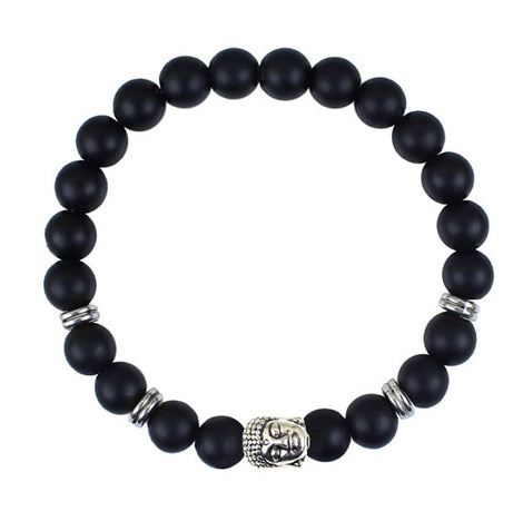 Black Agate 8mm Bead Bracelet with Buddha Head Silver Color - Buddhist Mala Jewelry - Length Approx 7 Inch - China - NEW423