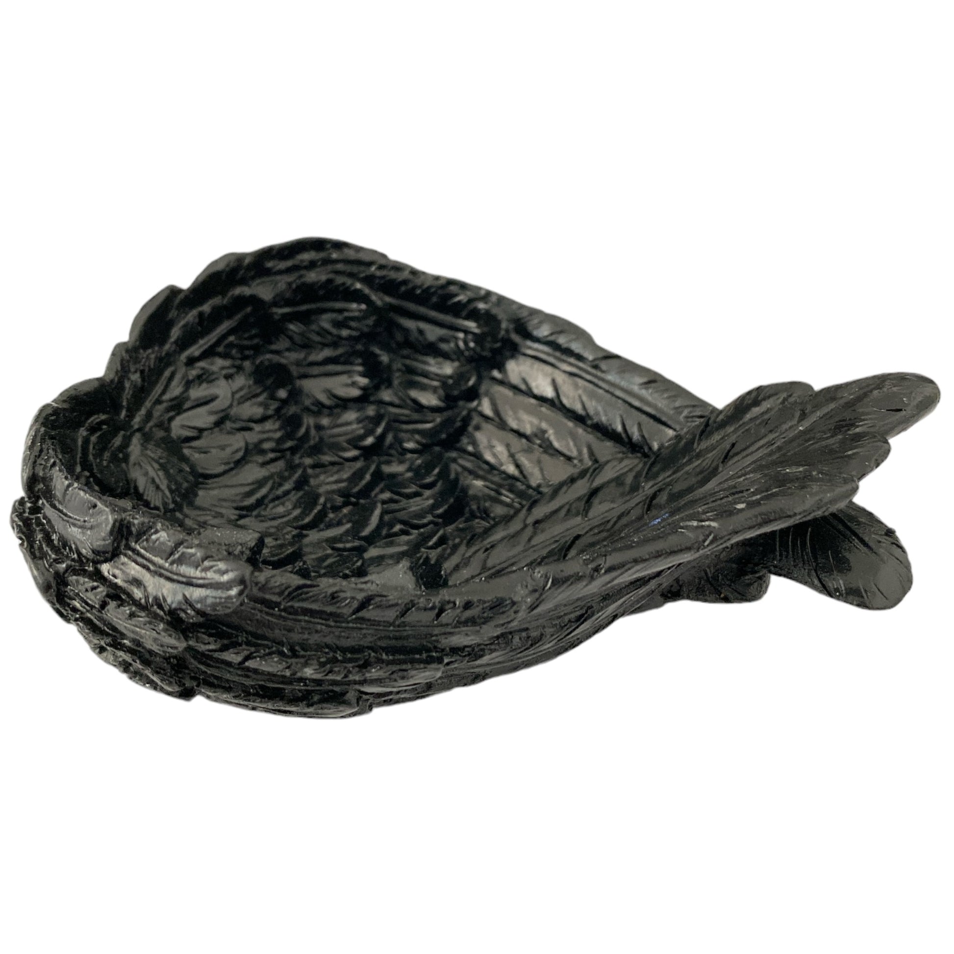 Add a touch of whimsy to your home with our Black Sphere & Stone Wing Display Bowl! The perfect size for holding jewelry or trinkets, with intricate wing details and a shimmering gold finish, this bowl is sure to be a conversation starter. Made of durable, high quality resin. Brand new - because who wants used wings?