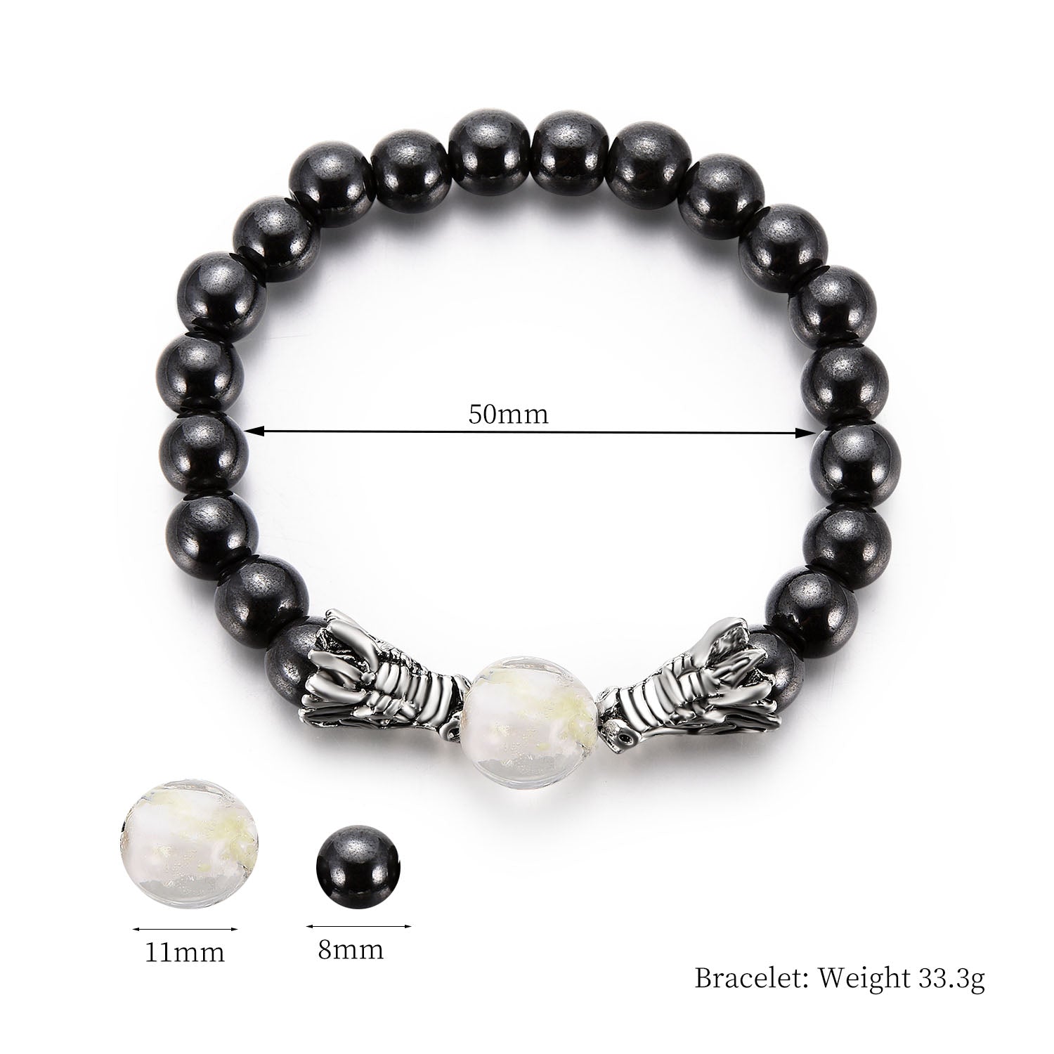 Non Magnetic Hematite Bracelet with Glass Bead - Antique silver color plated Dragon - 8mm and 11mm beads - 6 Inch.