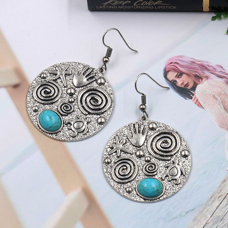 Vintage Tribal Round Zinc Alloy Drop Earrings with Howelite - Silver Plated - 36x56mm - NEW421