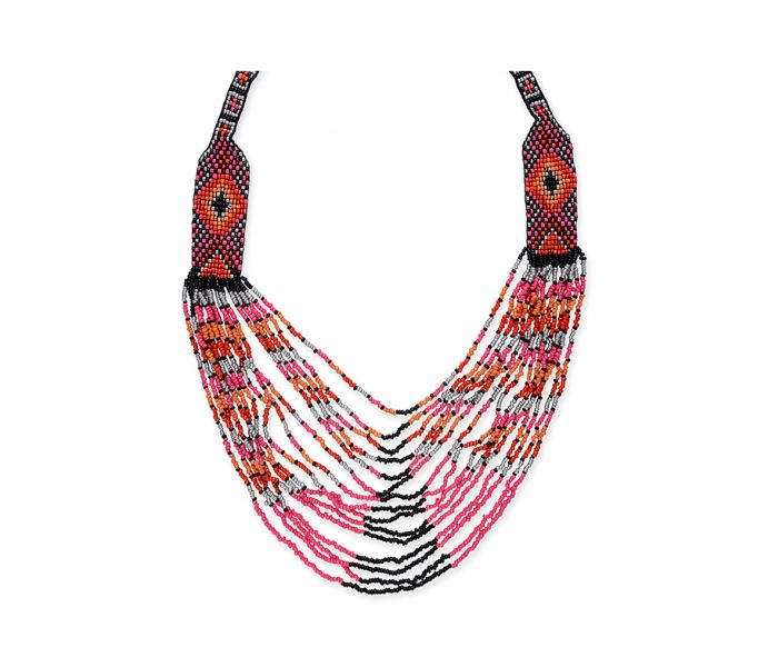 From its amazing palette of colors to its authentic Southwest-inspired design, this beaded necklace is exquisite in every detail. Streaming beaded strands join the two miniature tapestries one either side. A magnificent, unique piece.
