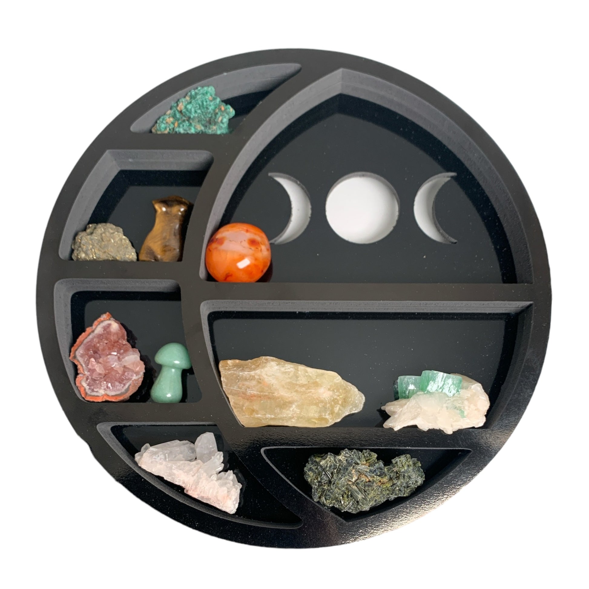 Store your crystals or other small decor pieces in these gorgeous decorative trays or table top display shelves. Multiple designs for various aesthetic vibes. Crystal Display Shelf Moon Phase Decor Divination Meditation Décor Witchy Accessories Holder Metaphysical Stores New Age Supply Langley Surrey Vancouver Abbotsford Divination Supplies Crystals Occult Supplies