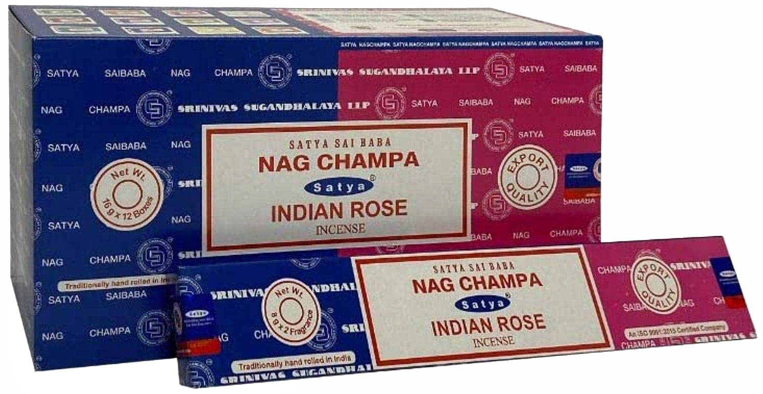 Satya Combo Series - Indian Rose & Nag Champa Incense - Box of 12 Packs Each pack contains 8gms of each scent - 16g NEW421