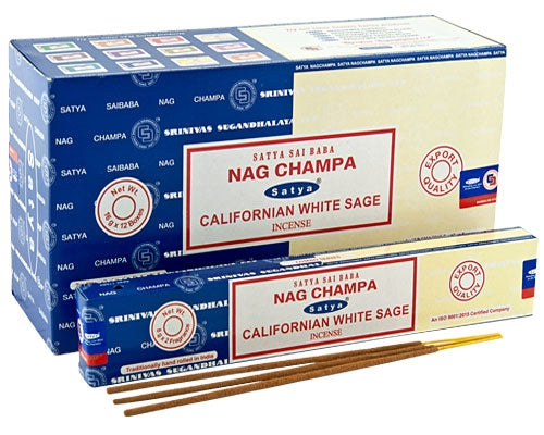 Satya Incense - White Sage & Nag Champa - Box Of 12 Packs - Each pack contains 8gms each of both scents - NEW1120
