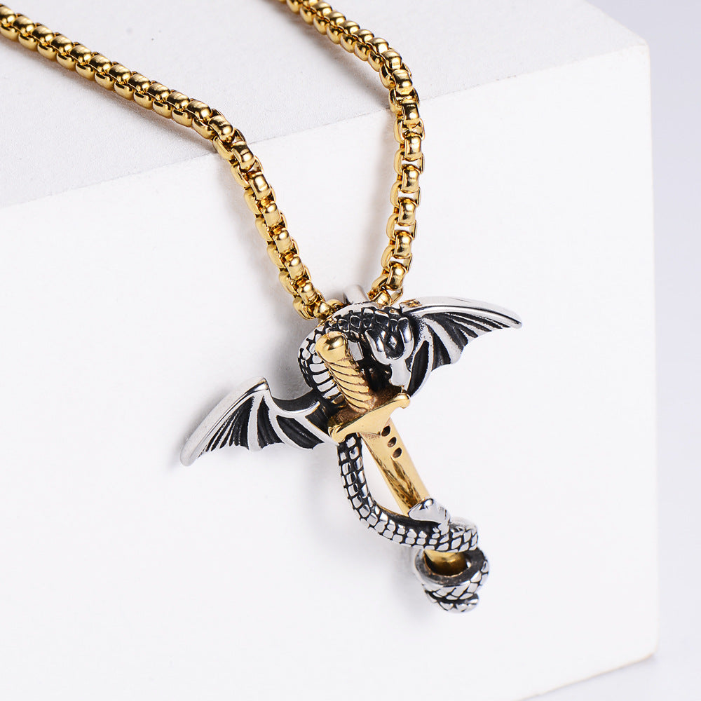 Stainless Steel Dragon with Sword with 60cm Golden chain - Silver Color - 45x41mm 17 grams - NEW922