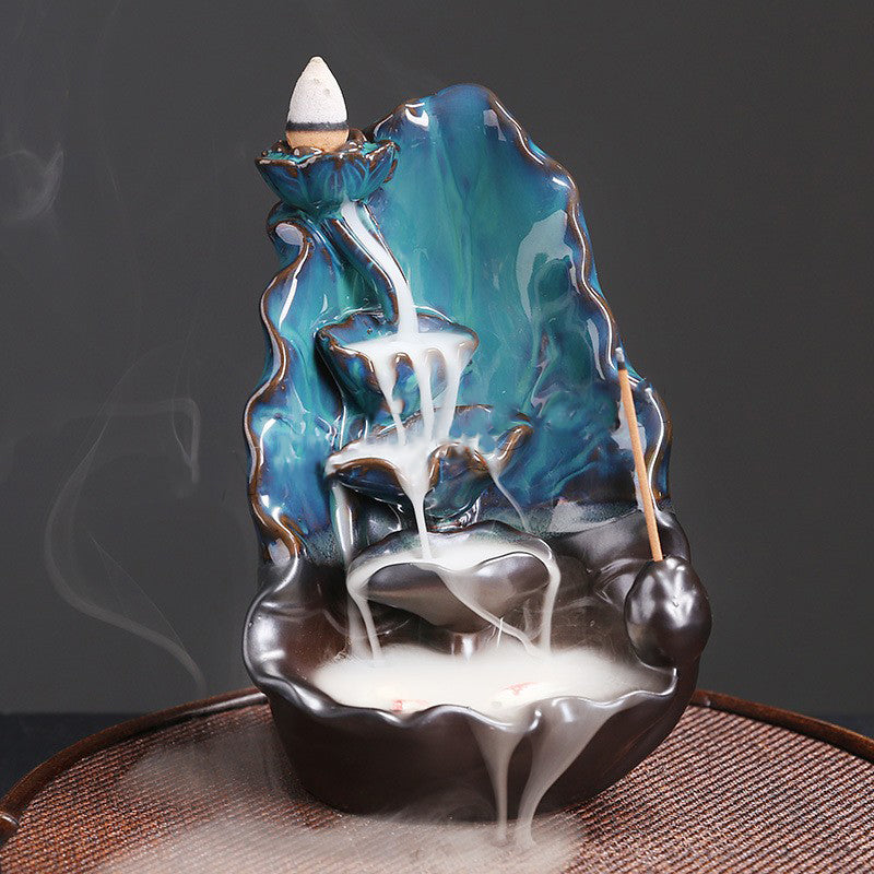 Waterfall Backflow Incense Burner Ceramic - Blue Glaze with Black - 10x9.6x16cm